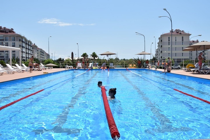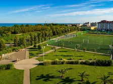 Уличные тренажеры, подогреваемый открытый бассейн (платно), бадминтон, спидминтон, баскетбол, волейбол, сапсерфинг.